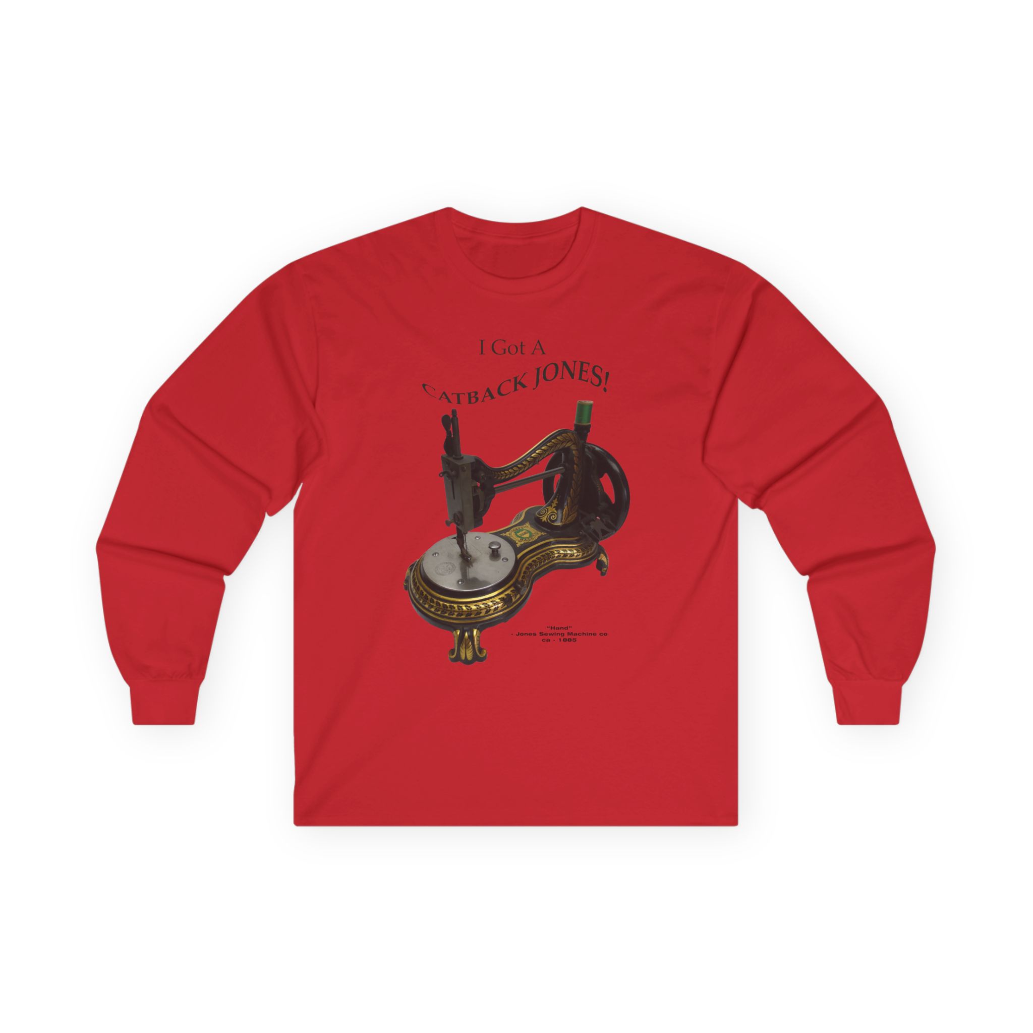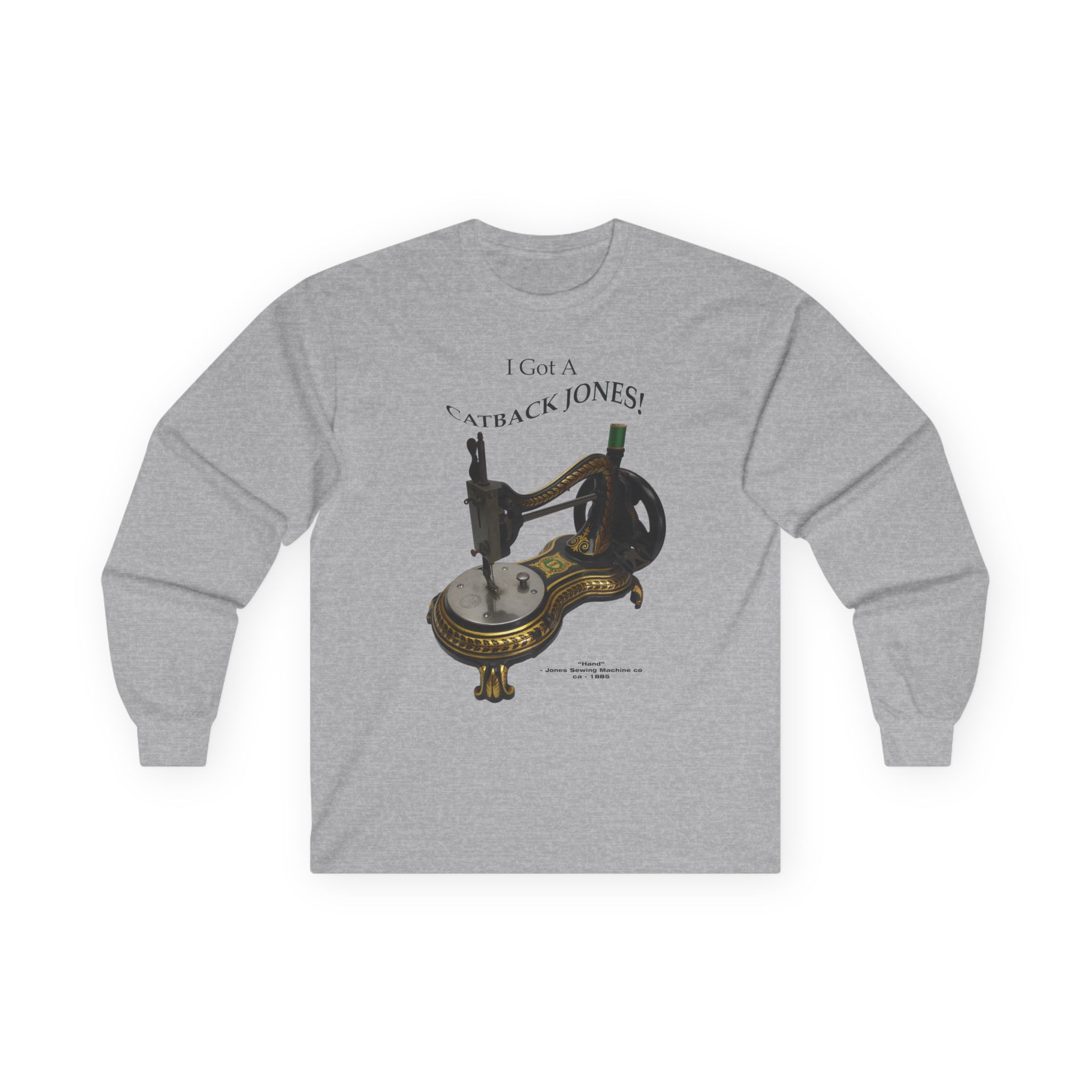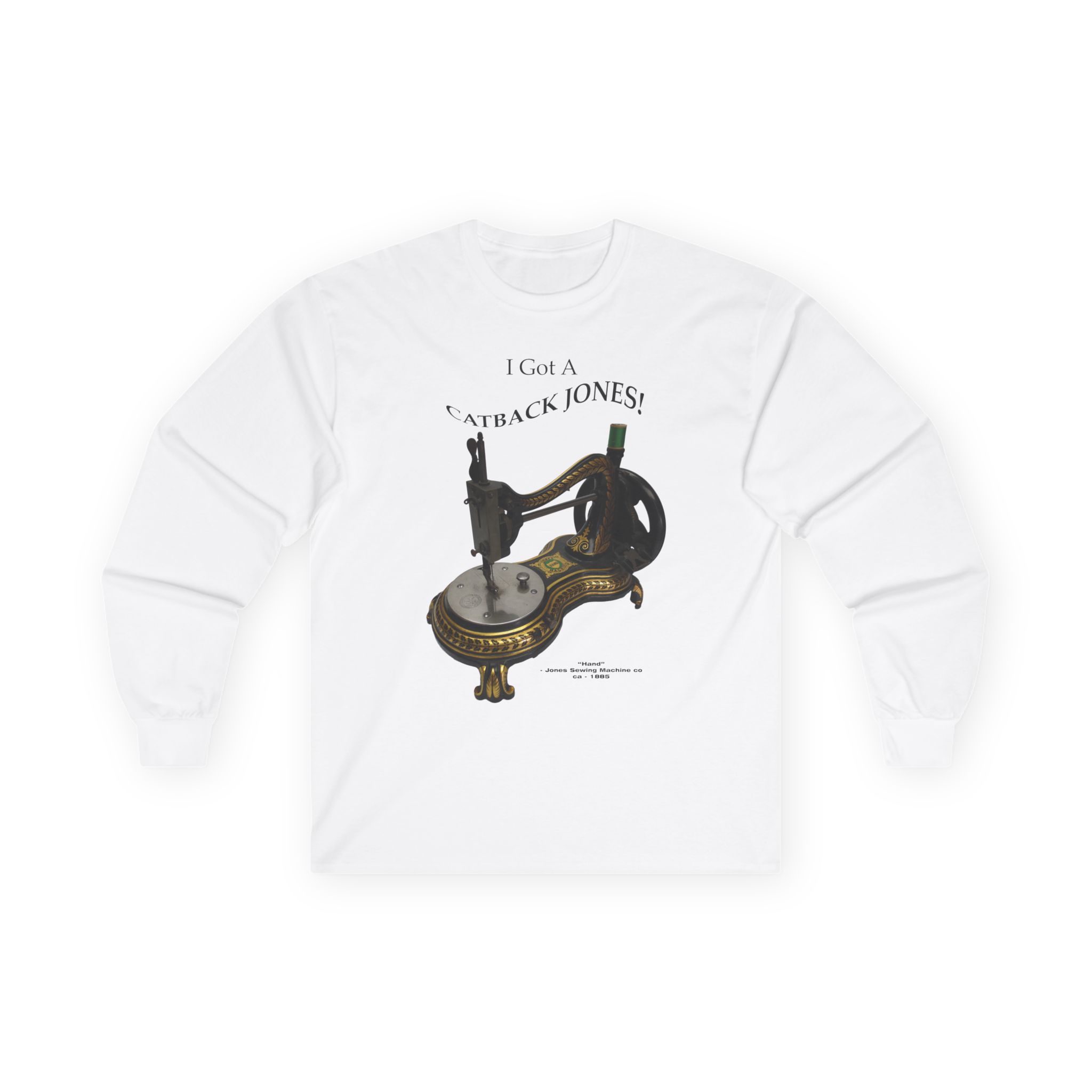 This machine is the “Hand” model made by the Jones Sewing Machine Co. near Manchester, England in circa 1885. This is the “Serpentine” style which is often called the “Catback” or “Swan Neck” style. They were very popular in that time period and are still widely collected. Several companies made variations on that design.
