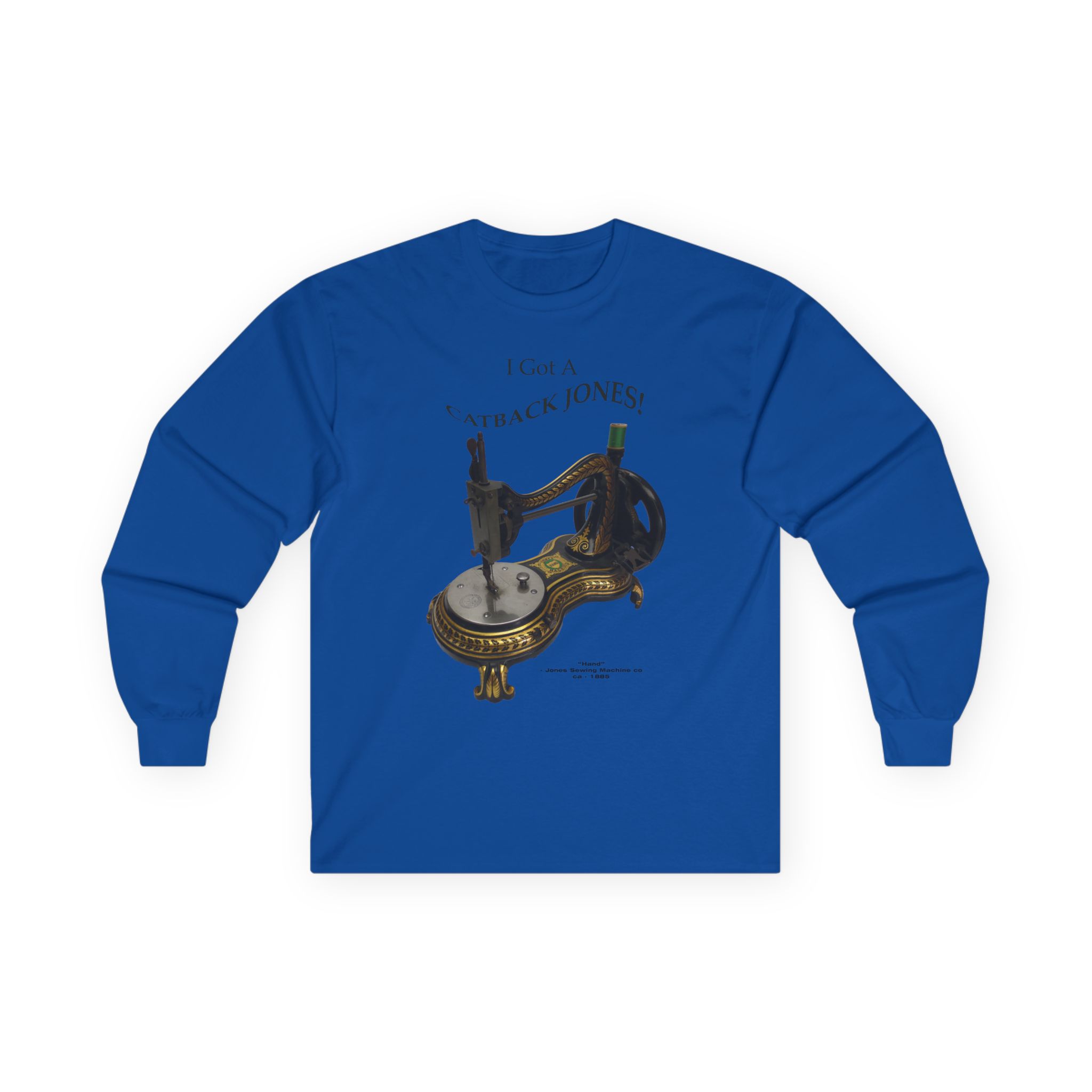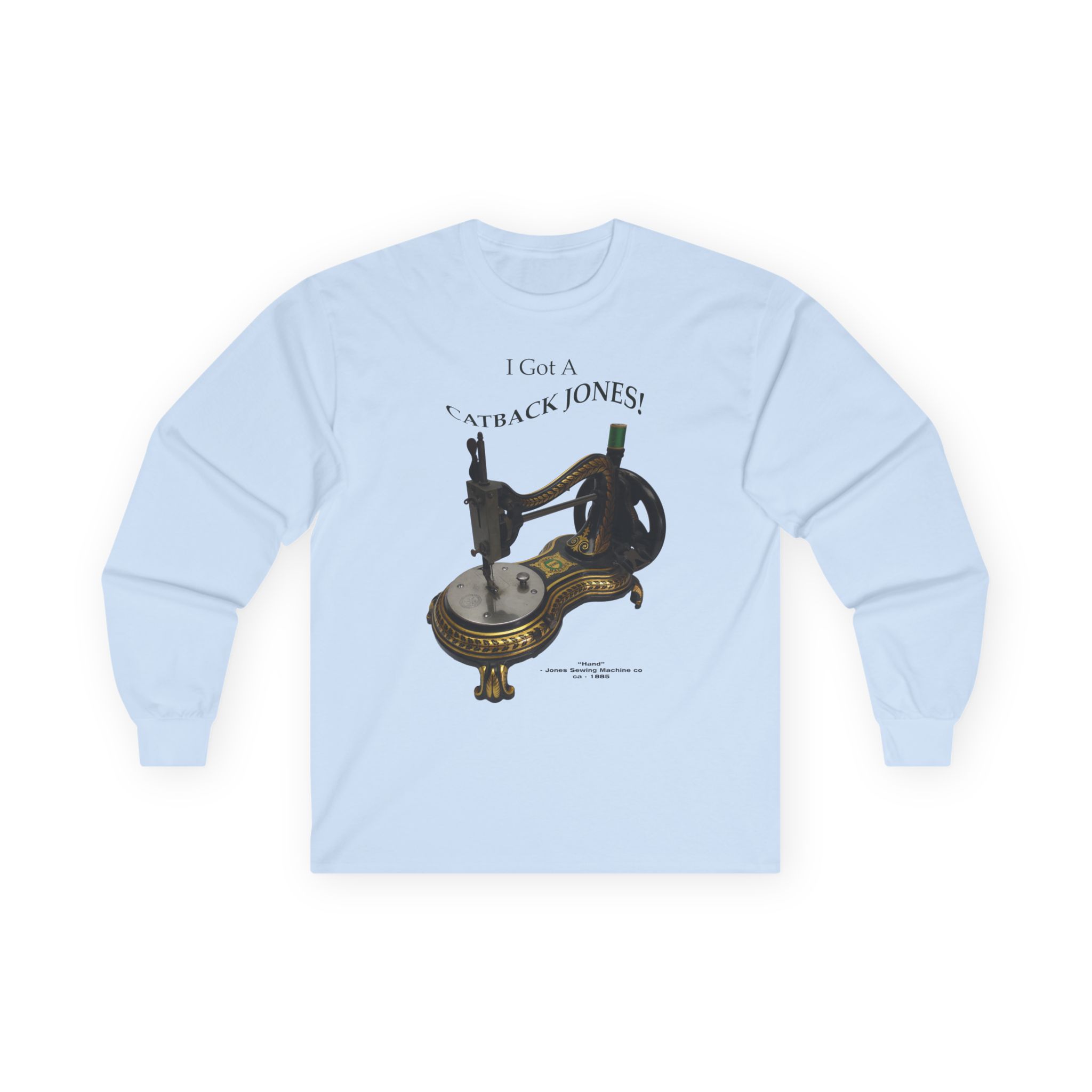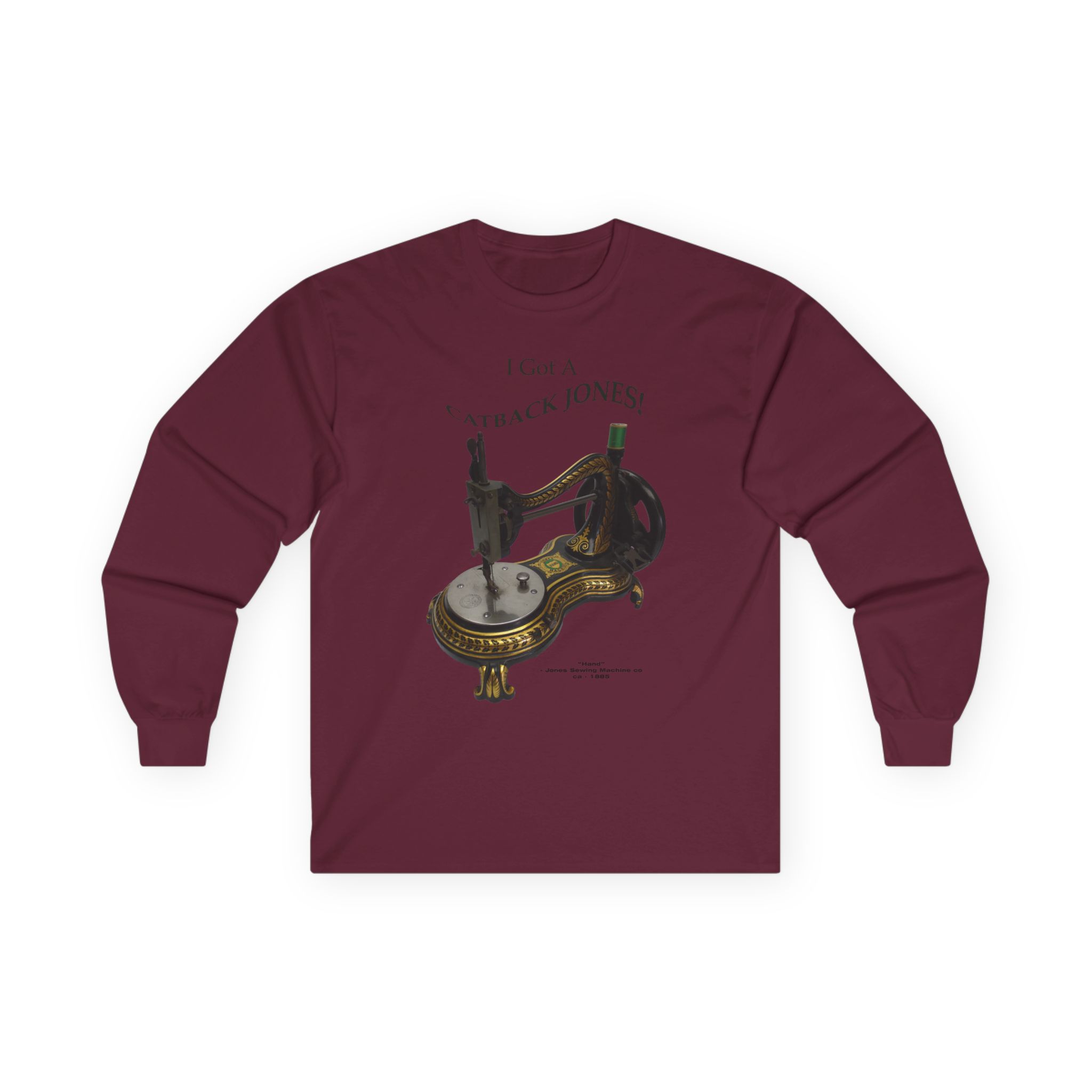 This machine is the “Hand” model made by the Jones Sewing Machine Co. near Manchester, England in circa 1885. This is the “Serpentine” style which is often called the “Catback” or “Swan Neck” style. They were very popular in that time period and are still widely collected. Several companies made variations on that design.